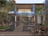 横向跨度再加以弧形边框,在色彩与材质方面运用古铜色铝板承接传统美学与极简现代化的色彩,质感十足,清雅的同时又不失尊贵感。