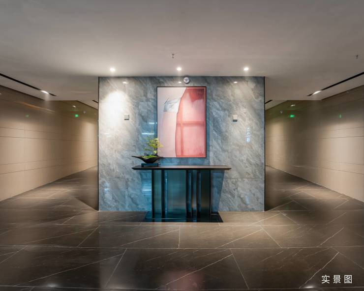 公区大堂采用瓷砖、金属、木饰面等材料,色彩与纹理和谐辉映,顶面线形灯带、深色金属尊贵电梯厅,内部加以艺术画点缀,高贵雅致。