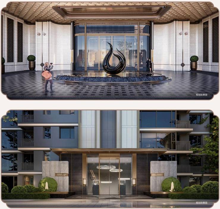 以海派精致主张绘制风范住区,将社区每个触点植入美学与秩序的考量,从铝板玻璃幕墙公建立面到“星级酒店式归家大堂--入户双大堂--电梯外玄关”三重递进式归家礼序,复刻登堂入室的尊荣,集萃奢华酒店设计风格,时刻酝酿生活仪式感。