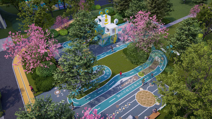 一环:环绕式650米有氧健身跑道,设置有热身器械、休憩座椅等,配合社区景观实现功能与景观自然结合。