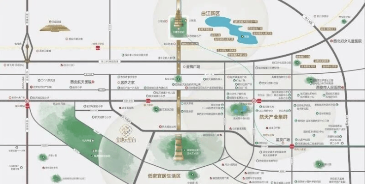 项目紧邻揽月阁,周边地块容积率普遍偏低,周围四大公园环绕,东侧为代建口袋公园,形成2公里范围内公园环抱的宜居环境,成就品质低密生活住区。星河运动公园/航天城中湖公园/西安航天城文化生态园/少陵塬公园