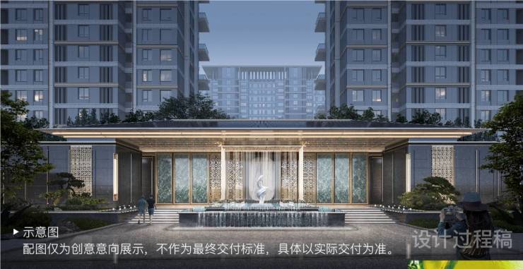 盛唐宫苑飞檐为灵感,约36米巨幅恢弘屋檐,7.9米挑高门厅,融合酒店式落客前场、高门台基,多重水境精奢石材与名贵树种,塑造层层叠翠归家仪式,再现名门世家威仪。