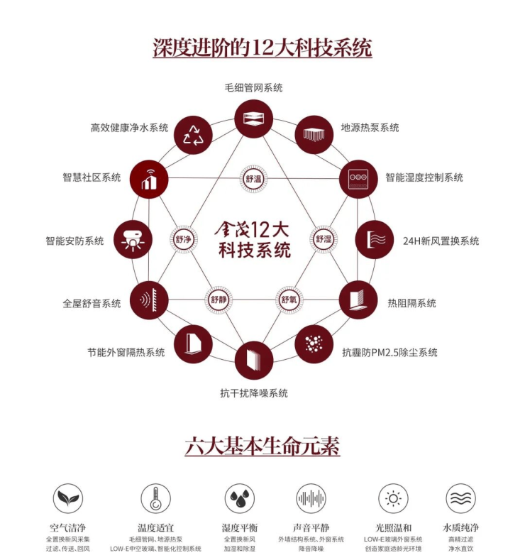 从2009年开创科技居住先例——广渠金茂府,到2018年发布绿色健康、智慧科技升级的"金茂2.0",中国金茂"臻绿品质",从"温度、湿度、空气、阳光、水、声音"六大基本生命元素延伸12大绿金智慧科技系统,实现"舒湿、舒温、舒氧、舒净、舒静"的五舒居住环境。