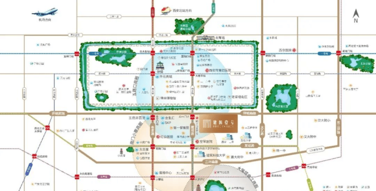 项目位于建国门与和平门之间,环城南路东段南侧。占据一环城芯的位置,北侧对望明城墙,距环城公园和护城河仅一路之隔,是目前大西安离城墙最近的一个项目,是真正的皇城福祉,大西安的原点核心。 主城一环,聚集了整个城市发展的原动力——最好的基础设施、教育配套、金融商业、行政资源、人文遗迹等时代地标,彰显了一座城市的历史底蕴。同样,也是城市最具价值的“贵胄”之地。城市中心最令人心动的,一是还原城市生活的温暖尺度,二是为居住于此的人们,提供更多的生活选项。