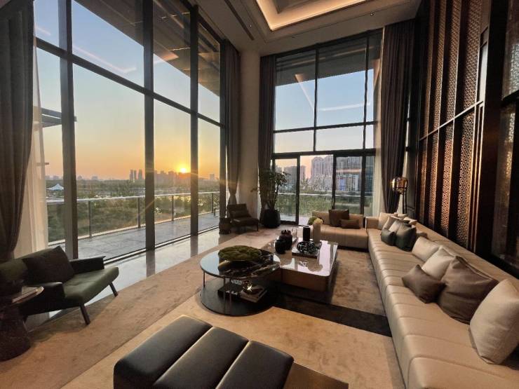 项目整体规划因地制宜,借助长安公园地块天然优势将建筑群落斜竖排布,依湖而建,营造四层低密大境