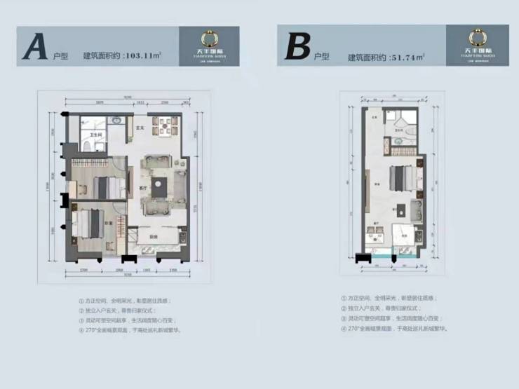 B户型为52平一室开间,独立厨卫,3.6米层高,整体空间感开阔不压抑。