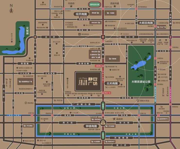 文化景观:尽享西安市地标级文旅景观,毗邻明城墙、环城公园约700米,距大明宫国家遗址公园约1公里,距钟鼓楼约2.5公里,距汉城湖约3公里,让主城中心生活的精彩与美好触手可得。